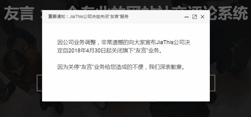 繼多說(shuō)后JiaThis旗下的第三方評(píng)論插件友言宣布關(guān)閉服務(wù)